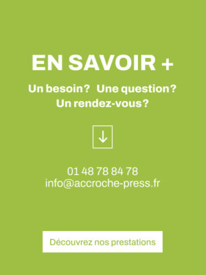 Depuis 2010, date de sa création, Accroche-press’ produit des contenus à fort bénéfice lecteur pour des éditeurs exigeants. À leur côté, l’agence crée les formats web et papier les plus adaptés à la nature des informations traitées, aux usages du public visé et aux règles d’attractivité des contenus publiés. Accroche-press’ a une parfaite connaissance des exigences de la presse, des impératifs techniques et technologiques tout au long de la chaîne de fabrication et de la complexité des modèles économiques des éditeurs. Alliant rigueur et souplesse, Accroche-press’ met à votre disposition l’expertise de son équipe de journalistes et graphistes pour répondre à tous vos besoins.