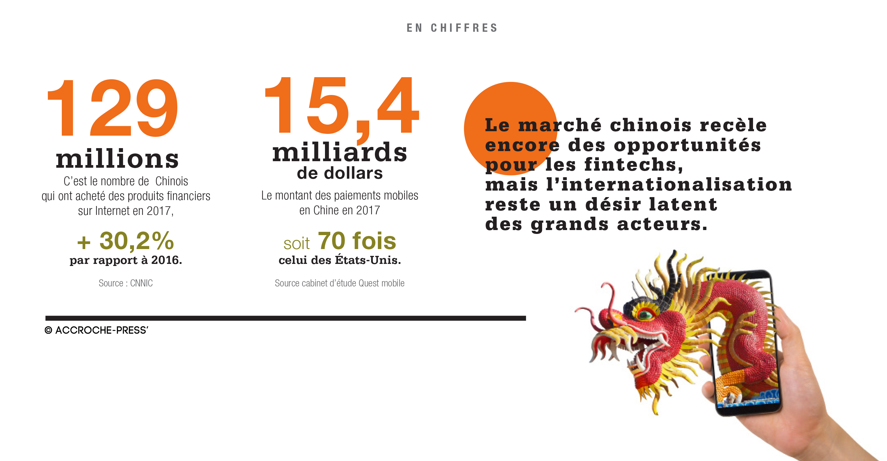 Ant Financial, solutions de paiement online et plateforme mondiale de transactions financières, Zhong An, assureur digital, Qudian, spécialiste du microcrédit en ligne… Sur les trois premières marches du podium mondial des start-up de la finance, trônent les entreprises chinoises. Les critères ? L’innovation, l’activité de recherche, les capitaux, la taille et la portée des sociétés. Une situation que confirme Frédéric Abécassis, vice-président de Capgemini Consulting Hong Kong & Asie du Sud-Est : « Aujourd’hui, la Chine est le premier marché de la fintech. Les investissements ont commencé à décoller en 2013 et la Chine a très vite pris le pouvoir. Sur les vingt-sept licornes fintech au monde, ces sociétés valorisées à plus d’un milliard de dollars, huit sont chinoises. »